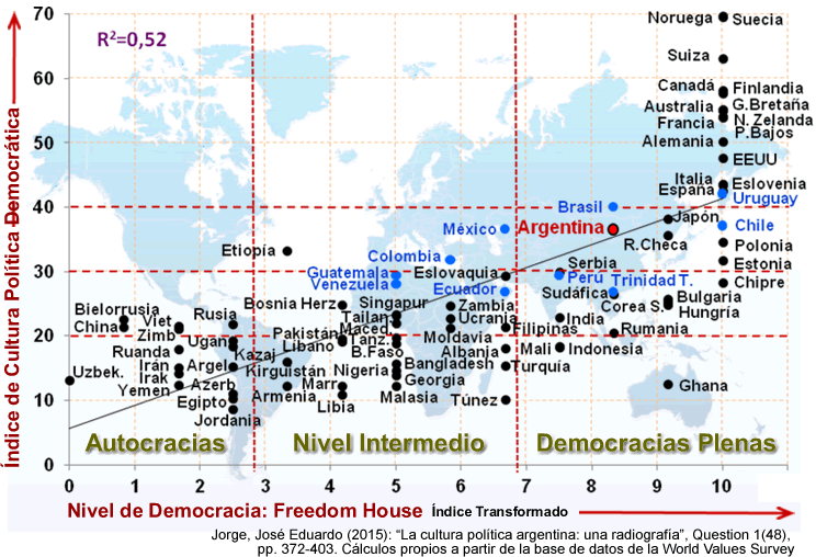 Además de elaborar un Índice de Cultura Política Democrática, aplicarlo a una muestra de 82 países y usar modelos estadísticos para mostrar su capacidad de predecir el nivel de democracia -una escala de 0 a 10 basada en el índice de derechos políticos y libertades civiles de Freedom House-, he propuesto un modelo que tiende a articular las diferentes teorías del campo de estudio y derivé de él una serie de hipótesis sobre la cultura política de las democracias “adjetivadas” o de baja calidad. [1]