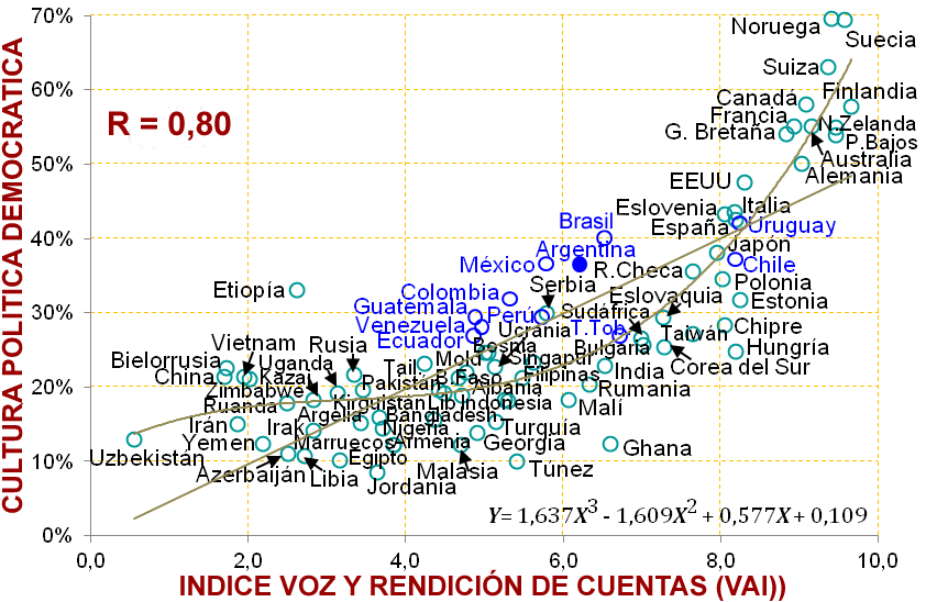 Hacia un Índice de Cultura Política Democrática. Su diseño y aplicación a una muestra de 82 países, mediante cálculos propios a partir de la base de datos de más de 400 mil casos de la Encuesta Mundial de Valores. El índice es capaz de predecir el Nivel de Democracia, medido a través del indicador de Freedom House, aun cuando se incorporan a los modelos estadísticos el ingreso por habitante, el índice de desarrollo humano del PNUD, el coeficiente de Gini y los años de democracia continua.