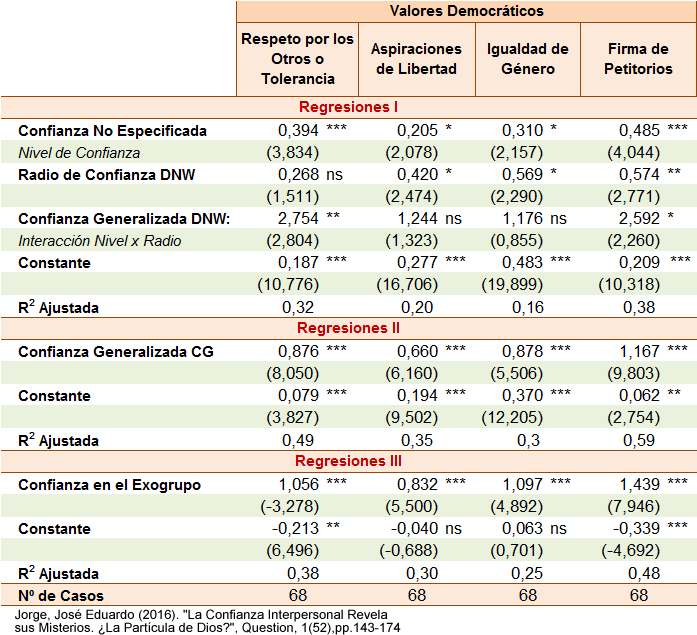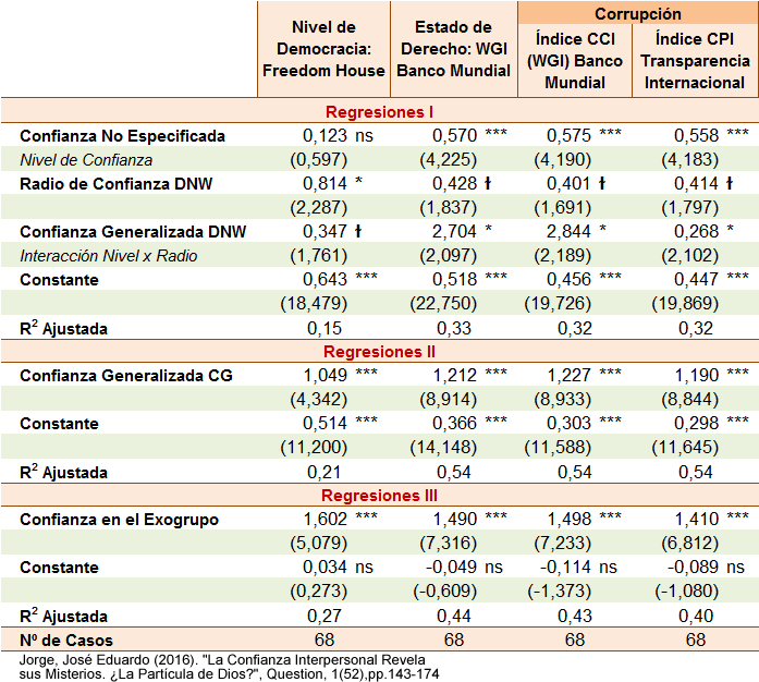 - Fuente: Jorge, José Eduardo (2016): «La Confianza Interpersonal Revela sus Misterios. ¿La Partícula de Dios?», Question 1(52), pp. 143-174. Cálculos propios a partir de la base de datos de la Encuesta Mundial de Valores (World Values Survey). Las entradas son coeficientes de regresión no estandarizados (valores t entre paréntesis). Sobre la construcción de estos modelos, ver Nota 5. Todas las variables dependientes son escalas entre 0 y 1. Casos: 69 países de la Tabla A. Datos más próximos al Año WVS. Valores Democráticos: Ver Nota 6. Nivel de Democracia y Estado de Derecho: Ver Tabla A y Nota 4. Índices de Corrupción: Control of Corruption (WGI Banco Mundial) y Corruption Perception Index (CPI) de Transparencia Internacional (TI). Confianza en las Instituciones: proporción de la población que confía «mucho» o «bastante» (promedio entre las instituciones indicadas). Organizaciones Voluntarias: proporción de la población que es «miembro» y «miembro activo». ***p<0.001 **p<0.01 *p<0.05 ɫ p<0.1 ns: no significativo