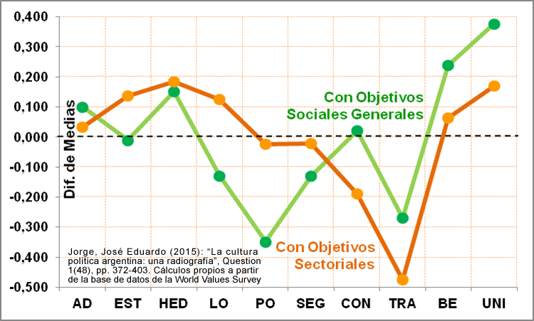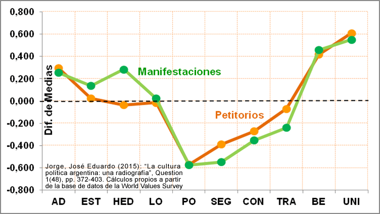 Click en la imagen para agrandar. Diferencia de Medias: Promedio de cada Valor de Schwartz (escala 1 a 6) del grupo de encuestados que realizó la acción (firmar un petitorio o asistir a una manifestación) menos el Promedio del grupo que «nunca lo haría». Firma de Petitorios (N= 564) y Asistencia a Manifestaciones (N= 512). La escala de cada Valor de Schwartz está centrada en el promedio de cada entrevistado sobre los 10 valores. Fuente: José Eduardo Jorge (2015). Cálculos propios a partir de la base de datos de la Encuesta Mundial de Valores Argentina 2013