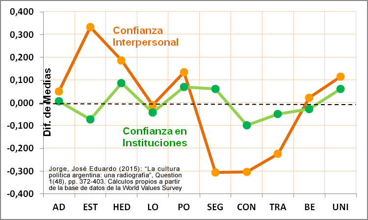 Click en la imagen para agrandar. Diferencia de Medias: Promedio de cada Valor de Schwartz (escala 1 a 6) del grupo que Confía menos el Promedio del grupo que No Confía. Confianza Interpersonal: «Se puede confiar en la mayoría de las personas» (N= 945). Confianza en Instituciones: Altos menos Bajos en una Escala promedio de confianza (1 a 4) en el Gobierno, el Congreso, los Partidos, los Funcionarios, la Justicia y la Policía (N=529). La escala de cada Valor de Schwartz está centrada en el promedio de cada entrevistado sobre los 10 valores. Fuente: José Eduardo Jorge (2015). Cálculos propios a partir de la base de datos de la Encuesta Mundial de Valores Argentina 2013