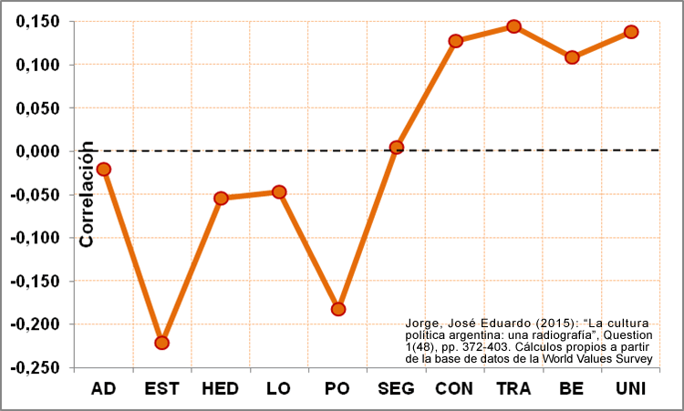 Click en la imagen para agrandar. Coeficiente de Correlación parcial de Pearson entre cada Valor de Schwartz (escala 1 a 6) y el Promedio de los 4 indicadores de Conformidad con las Normas Cívicas, escala 1 a 10 invertida (10=»nunca» justifica un comportamiento no cívico). Indicadores: aceptar una coima, engañar con los impuestos, no pagar el transporte público y reclamar sin derecho un beneficio del Estado. Fuente: José Eduardo Jorge (2015). Cálculos propios a partir de la base de datos de la Encuesta Mundial de Valores Argentina 2013