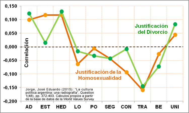 Click en la imagen para agrandar. Coeficiente de correlación parcial de Pearson entre cada Valor de Schwartz (escala 1 a 6) y la Justificación de la Homosexualidad (escala 1 a 10) (N=885) y del Divorcio (1 a 10) (N=913), controlando por el promedio individual de los 10 ítems de valor de Schwartz. Exclusión de casos perdidos según lista. Fuente: José Eduardo Jorge (2015). Cálculos propios a partir de la base de datos de la Encuesta Mundial de Valores Argentina 2013