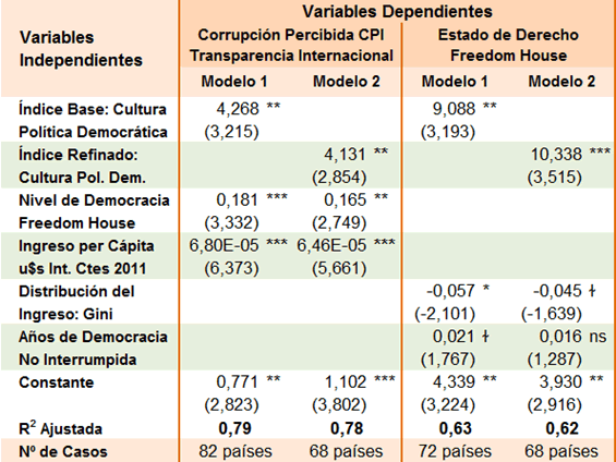 Como vemos en los modelos de regresión de la Tabla 4, la cultura política democrática es también un poderoso predictor de la corrupción percibida según Transparencia Internacional, aun manteniendo constante el ingreso per cápita y el nivel de democracia según Freedom House.