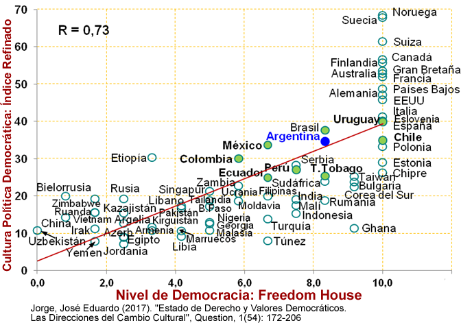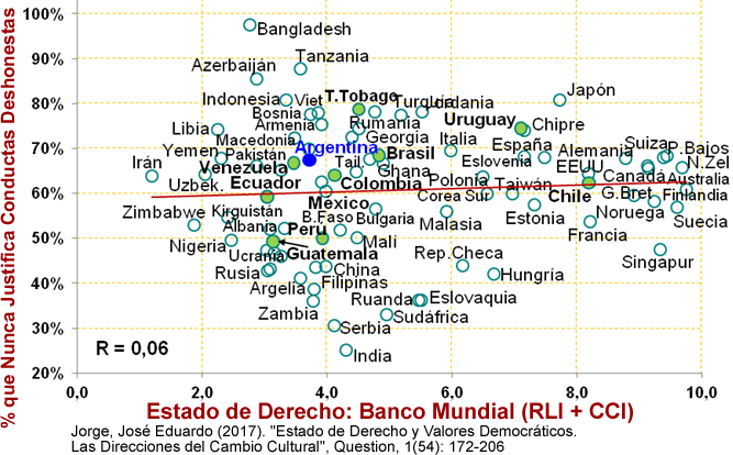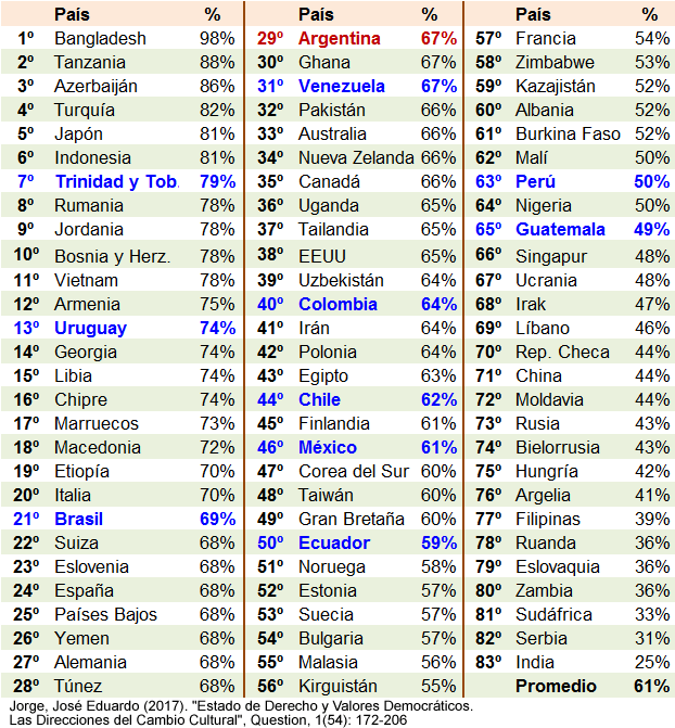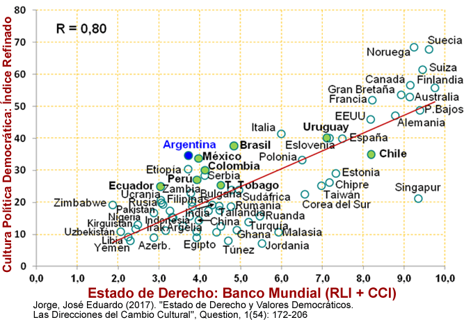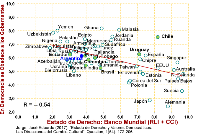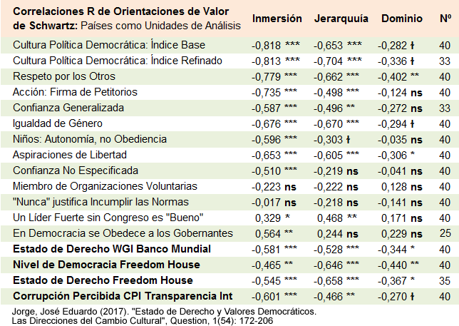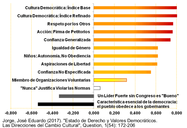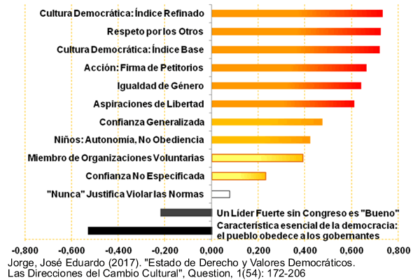 - Fuente: Jorge, José Eduardo (2017): “Estado de Derecho y Valores Democráticos: las Direcciones del Cambio Cultural”, Question, 1(54), pp. 172-206. Click en la imagen para agrandar