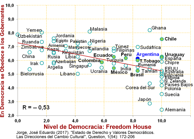 - Fuente: Jorge, José Eduardo (2017): “Estado de Derecho y Valores Democráticos: las Direcciones del Cambio Cultural”, Question, 1(54), pp. 172-206. Países de la Tabla A-Anexa. Indicador «en democracia se obedece a los gobernantes»: Promedio por país (escala 1 a 10). Cálculos propios a parte de la World Values Survey. Click en la imagen para agrandar