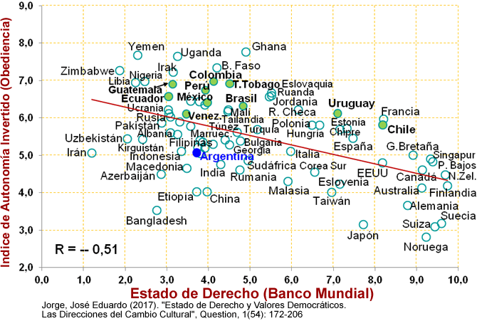 - Fuente: Jorge, José Eduardo (2017): “Estado de Derecho y Valores Democráticos: las Direcciones del Cambio Cultural”, Question, 1(54), pp. 172-206. N=83 países de la Tabla A-Anexa. Índice de Autonomía Invertido: valor promedio del índice por país. Cálculos propios a partir de la World Values Survey. Click en la imagen para agrandar