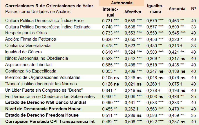 Del mismo modo, las dos tablas reflejan que los indicadores de estado de derecho, nivel de democracia y transparencia institucional tienen las correlaciones previstas por la teoría con los valores culturales de Schwartz: claramente positivas con autonomía intelectual e igualitarismo y negativas con jerarquía e inmersión en el grupo.