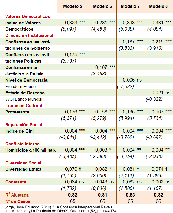 - Fuente: Jorge, José Eduardo (2016): «La Confianza Interpersonal Revela sus Misterios. ¿La Partícula de Dios?», Question 1(52), pp. 143-174. Cálculos propios. Las entradas son coeficientes de regresión no estandarizados (valores t entre paréntesis). Casos: Países de Tabla A-Anexo (Estadísticas: La Confianza Interpersonal en el Mundo). Datos más próximos al Año WVS. Variables Independientes: Ver notas de la Tabla A y Tabla B del Anexo (Estadísticas: Confianza y Cultura Cívica). Tasa de Homicidios: PNUD y base del Quality of Government Institute (Teorell et al., 2016) ***p<0.001 **p<0.01 *p<0.05 ɫ p<0.1 ns: no significativo. Click en la imagen para agrandar