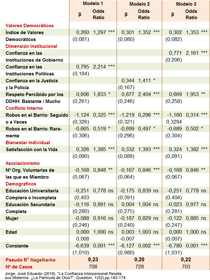 - Fuente: Jorge, José Eduardo (2016): «La Confianza Interpersonal Revela sus Misterios. ¿La Partícula de Dios?», Question 1(52), pp. 143-174. Cálculos propios a partir de la base de datos Argentina 2013 de la WVS. Las entradas β son coeficientes de regresión logística (error estándar entre paréntesis). Confianza Generalizada CG: variable dicotómica. Índice de Valores Democráticos: escala entre 0 y 10. Promedio de las escalas individuales de los cuatro indicadores de valores democráticos.Confianza en las Instituciones: escala entre 1 y 4 (promedio de las instituciones indicadas). Satisfacción con la Vida: escala entre 1 y 10. ***p<0.001 **p<0.01 *p<0.05 ɫ p<0.1 ns: no significativo. Click en la imagen para agrandar