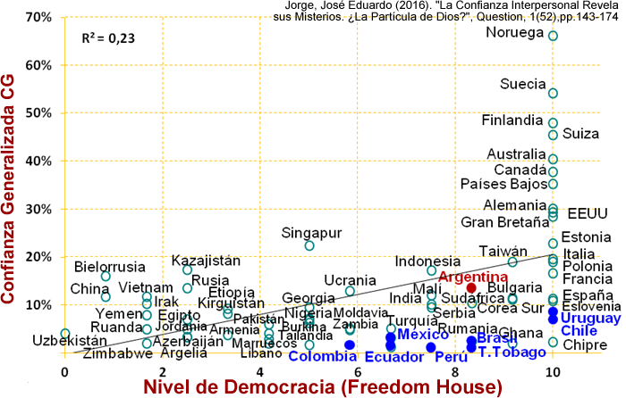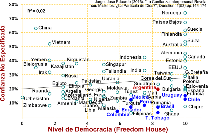 - Fuente: Jorge, José Eduardo (2016): “La Confianza Interpersonal Revela sus Misterios. ¿La Partícula de Dios?”, Question 1(52), pp. 143-174. Los porcentajes de confianza son cálculos propios a partir de la base de datos de la Encuesta Mundial de Valores. El Nivel de Democracia es una escala de 0 a 10 a partir del Índice de Derechos Políticos y Libertades Civiles de Freedom House. Datos en Tabla A del Anexo (Estadísticas: La Confianza Interpersonal en el Mundo) . Click en las imágenes para agrandar
