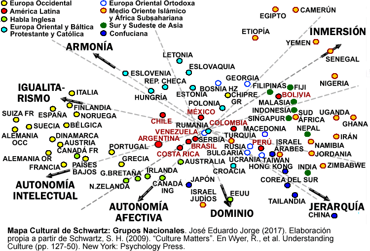 Del mapa emergen 8 “regiones culturales”, con muchas coincidencias con las de Inglehart y Welzel (Figura 4). Lo que suele llamarse “cultura occidental” tiene importantes diferencias internas. Europa Occidental es más alta en igualitarismo, autonomía intelectual y armonía. Los países de habla inglesa enfatizan la autonomía afectiva y el dominio (Schwartz, 2009). EE.UU acentúa aún más el dominio y menos el igualitarismo, la autonomía intelectual y la armonía; su perfil es el de una cultura emprendedora y pragmática. La cultura de América Latina es próxima al promedio mundial en las 7 orientaciones. Argentina y Chile estimulan más la autonomía intelectual y el igualitarismo, Bolivia la inmersión y Perú la jerarquía.