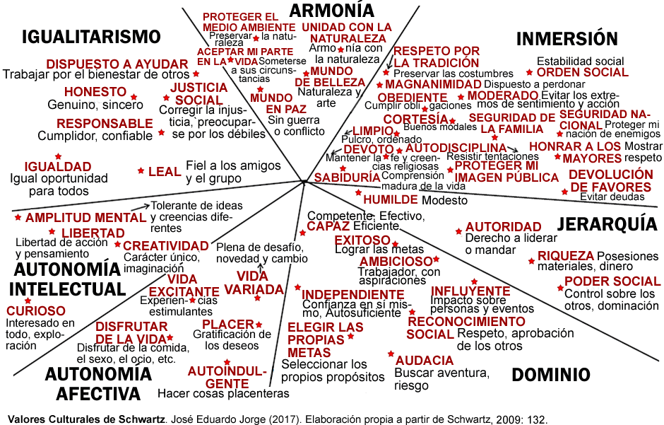 La descripción de cada valor en la figura sintetiza a la incluida en los cuestionarios de SVS. Las orientaciones adyacentes –por ejemplo, autonomía e igualitarismo, o inmersión y jerarquía- son compatibles (correlacionan positivamente) entre sí; las opuestas –autonomía e inmersión, o igualitarismo y jerarquía- están en conflicto. La cultura, en esta concepción, está “fuera” de los individuos y entraña las “presiones” –estímulos psicológicos y expectativas de rol- a las que aquéllos están expuestos (Jorge, 2017:180-83).