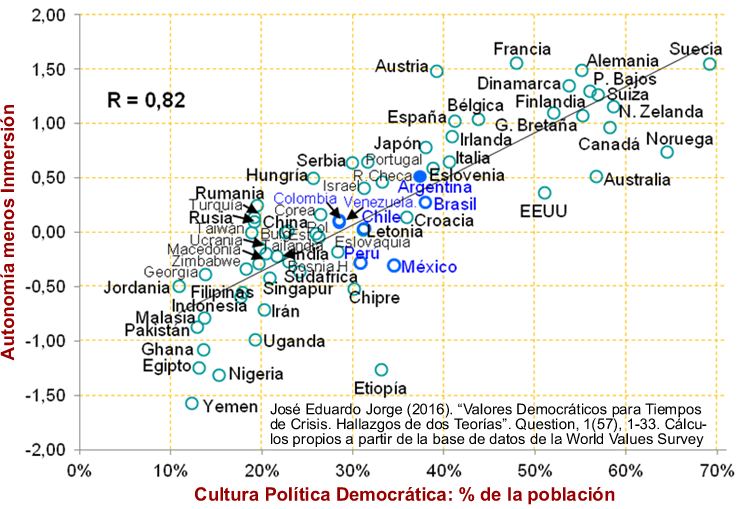 Nótese que el puntaje de autonomía es mayor que el de inmersión en todos los países con 36% o más de la población con valores democráticos arraigados según nuestro índice.