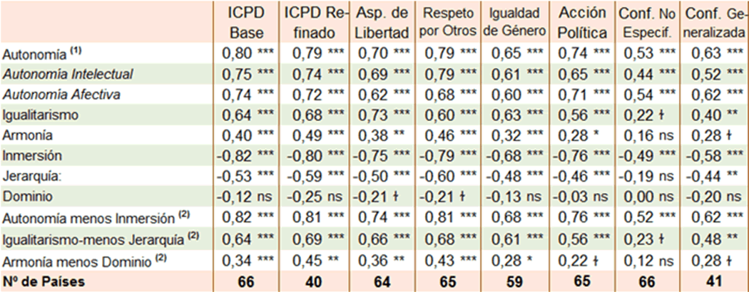 Las coincidencias comentadas entre ambas teorías son patentes en nuestra tabla. Como esperaríamos, nuestros dos índices tienen una fuerte correlación positiva con autonomía y negativa con inmersión. La asociación es menor, pero muy clara, con igualitarismo (positiva) y jerarquía (negativa).