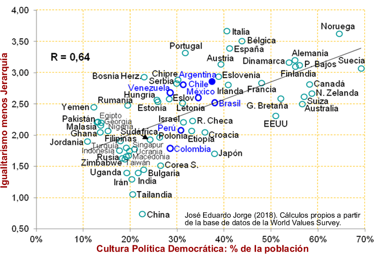 Entre quienes no poseen este tipo de valores emancipatorios, tales opiniones suelen encubrir “interpretaciones autoritarias de la democracia” (Welzel y Kirsch, 2017), que incluyen, por ejemplo, la idea de que uno de los rasgos “esenciales” del sistema es la “obediencia a los gobernantes”.